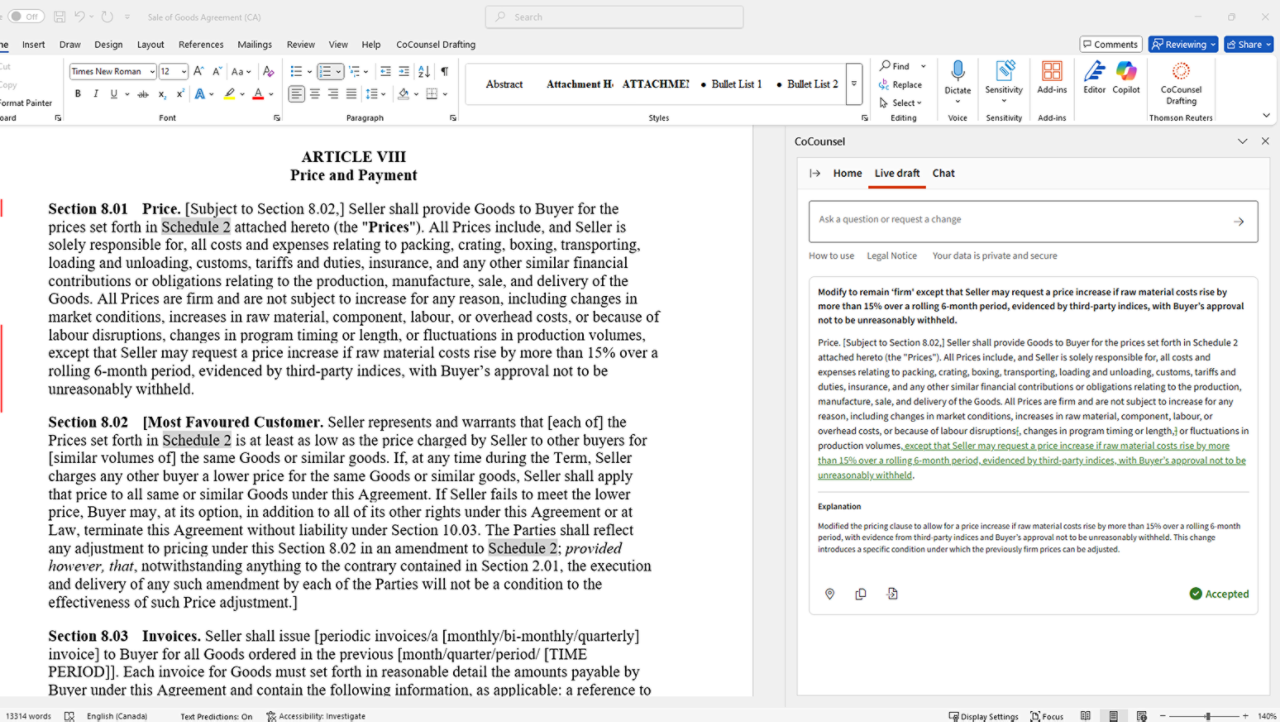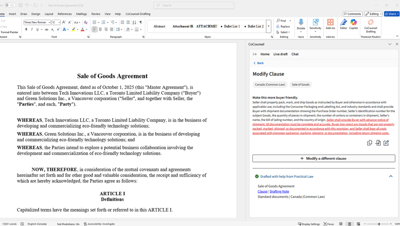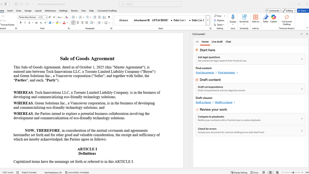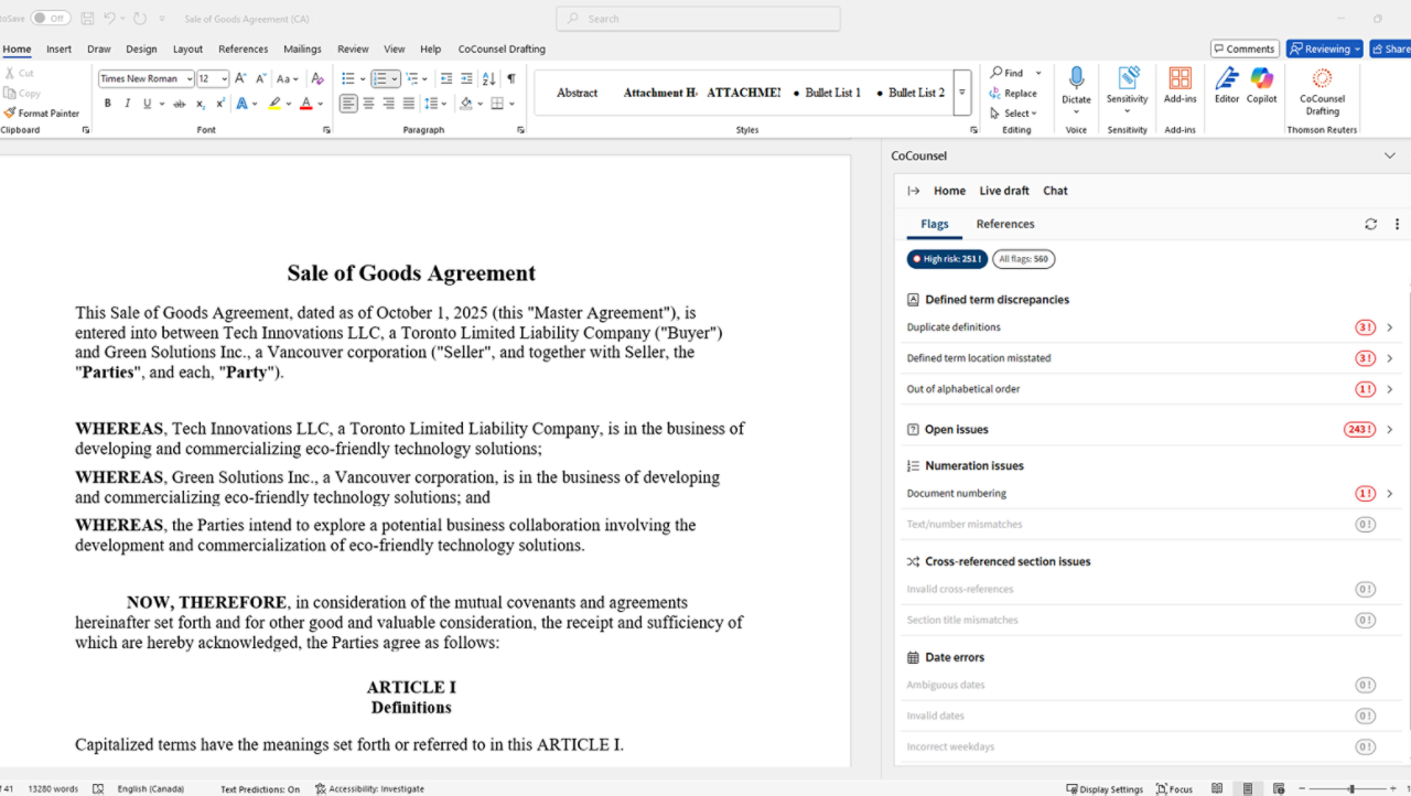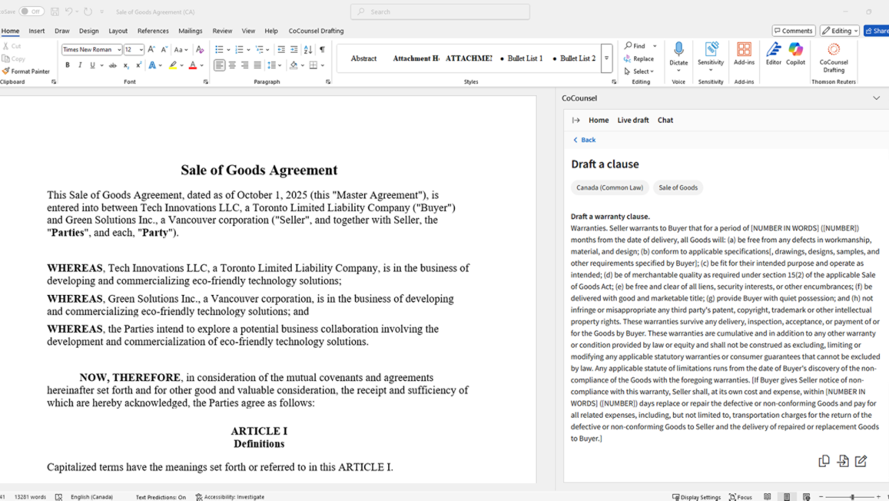 Create, review, and finalize legal documents with AI-powered skills from CoCounsel Drafting — all without leaving Microsoft Word
