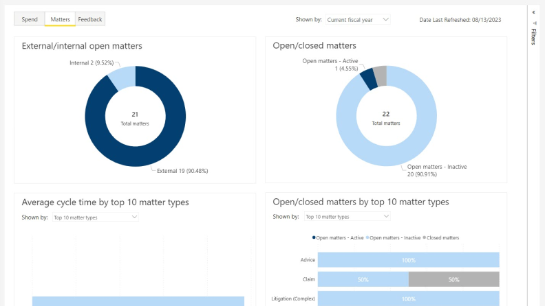 Gain access to hundreds of reports with easy-to-use filters and one-click drill-down reporting for additional detail. Trend analysis shows changes over time, so you can easily track results on all legal matters.