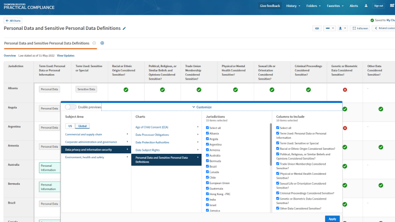 Access in-depth coverage across all core corporate compliance areas for the U.S., Canada, the UK, Australia, China, and the EU. Comparative overview coverage for 45 countries and vast resources focused on the needs of compliance teams operating globally. Filter by local, state, country, or global.