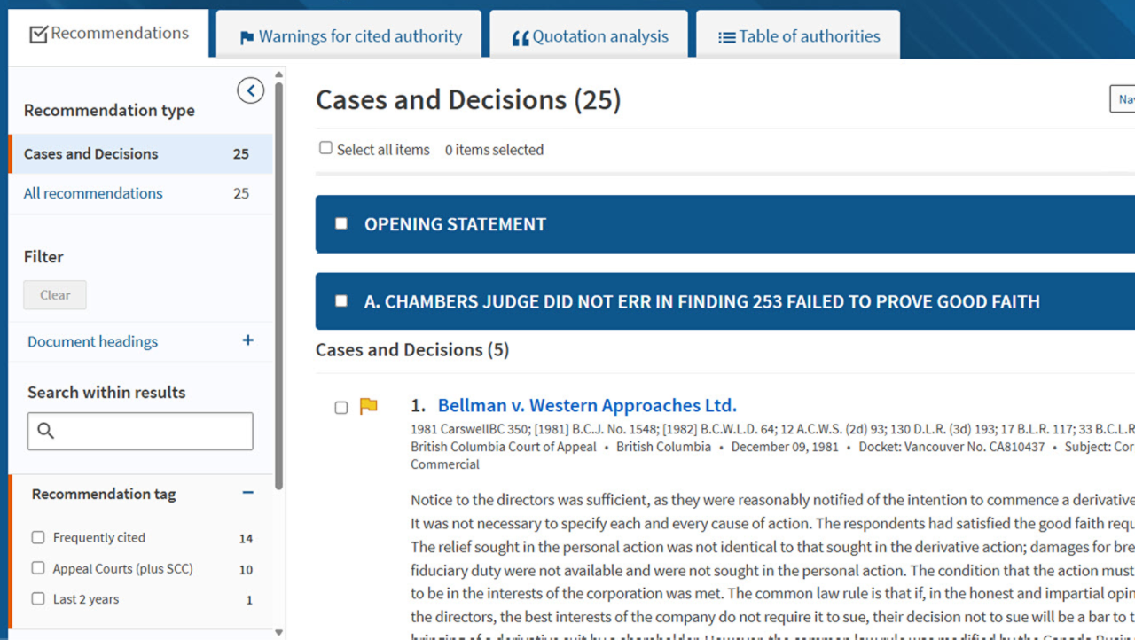 Access real-time answers and strategic insights with complete transparency, empowering you to act decisively and with confidence that every angle is covered. Westlaw Advantage Canada combines advanced agentic AI technology with trusted legal content and resources, enabling you to work quickly and logically throughout your entire research process.