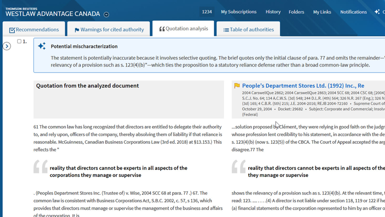 Upload your legal document — such as a memo, factum, or brief — and AI-powered Litigation Document Analyzer delivers a detailed report with recommendations, authority checks, quotation analysis, potential mischaracterization, and a complete table of authorities. This functionality helps you save time, reduce risk, and strengthen the quality of your legal arguments.