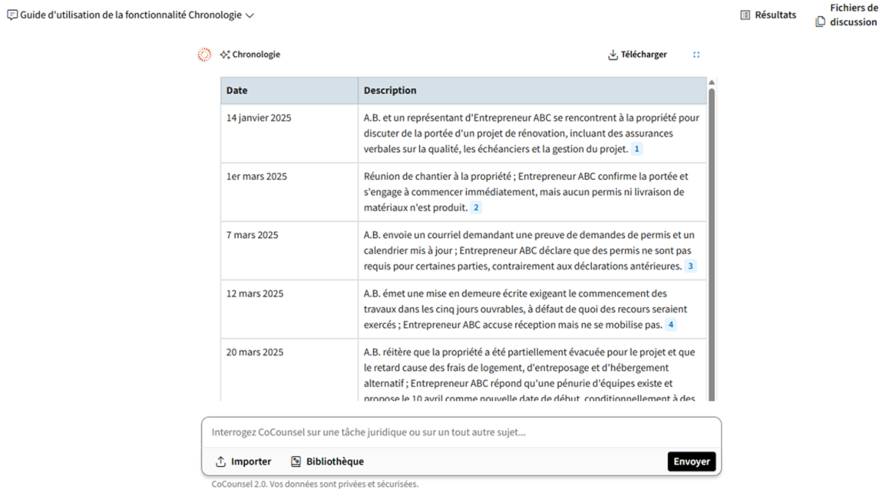 Assurez-vous de travailler et de présenter une chronologie précise des événements. Téléchargez un ensemble de preuves ou de documents relatifs à l'affaire et faites confiance à CoCounsel pour utiliser la fonctionnalité « Timeline » (Chronologie) de CoCounsel Core afin d'identifier les événements importants, classés par ordre chronologique, et de fournir des références aux sources principales.