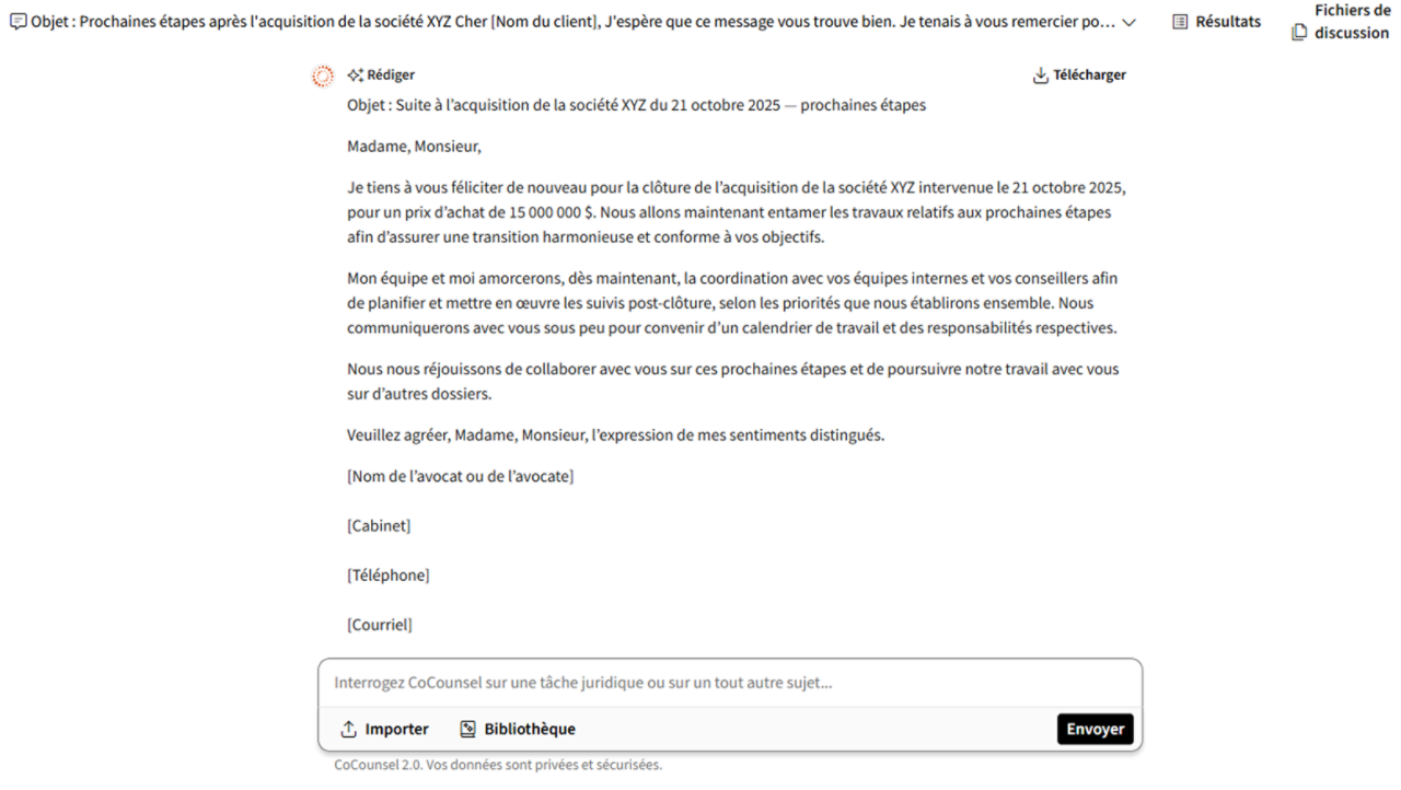 Automatisez et déléguez certaines tâches, telles que la rédaction de lettres et de courriel ou préparer l'interrogatoire d'un témoin et d'audits de conformité, afin de consacrer davantage de temps aux tâches qui requièrent votre expertise professionnelle.