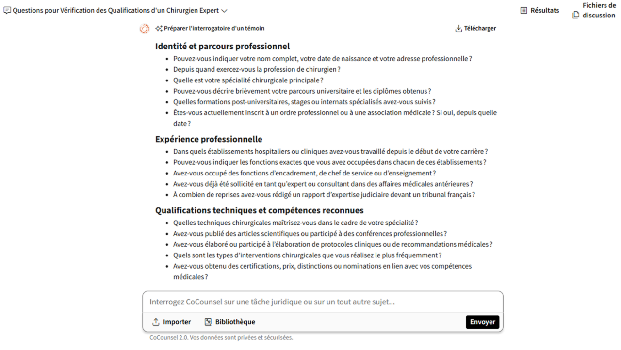 Optimisez votre temps lorsque vous vous préparez à interrogatoire d'un témoin. CoCounsel utilise la compétence « Se préparer à interrogatoire d'un témoin » pour vous aider à identifier les principaux sujets et questions à aborder lorsque vous vous préparez pour des dépositions à venir et d'autres projets d'enquête.