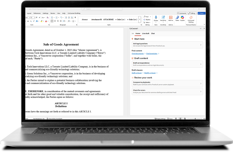 Accédez à CoCounsel Drafting directement où vous travaillez — dans Microsoft Word. Cette solution de rédaction sécurisée de bout en bout combine une IA de qualité professionnelle avec le contenu fiable de Practical Law, aidant les professionnels du droit à gagner du temps sans sacrifier la confidentialité ou l’exactitude des données. Moins de temps consacré à la rédaction signifie plus de temps pour le travail stratégique.