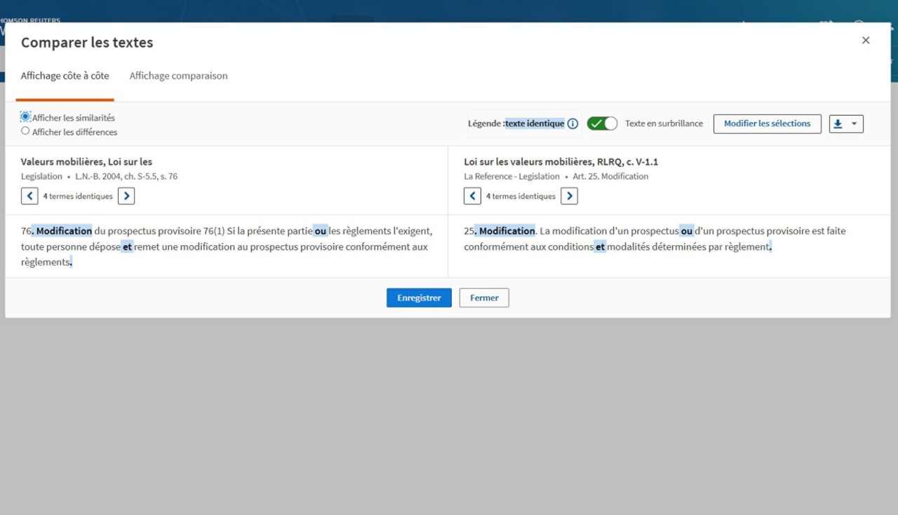 Comparez deux documents Westlaw afin d'identifier leurs différences et leurs similitudes. Affichez les modifications côte à côte ou en ligne avec des surlignages codés par couleur. Le rapport peut être téléchargé, imprimé ou envoyé par courriel.