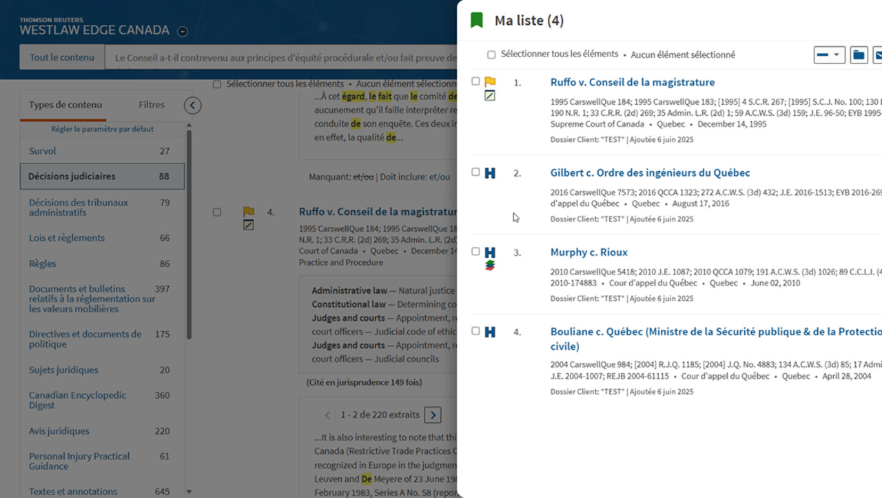 Trouvez rapidement les décisions traitant de questions dans un contexte procédural particulier sans avoir à parcourir des listes de résultats. Le filtre « Procédures » comprend 30 types de procédures permettant d'affiner la recherche jurisprudentielle au type de requête ou de demande pertinent.