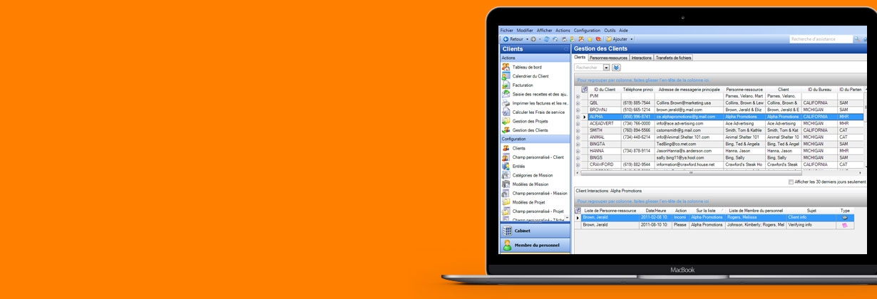 Parce que vous communiquez avec vos clients de plusieurs façons, incluant les appels téléphoniques, les courriels, les factures et les rencontres en personne, vous avez besoin d’un système qui vous aide à assurer le suivi effectif de chaque interaction, à surveiller les activités du client et à transmettre et recevoir la documentation de façon sécuritaire.